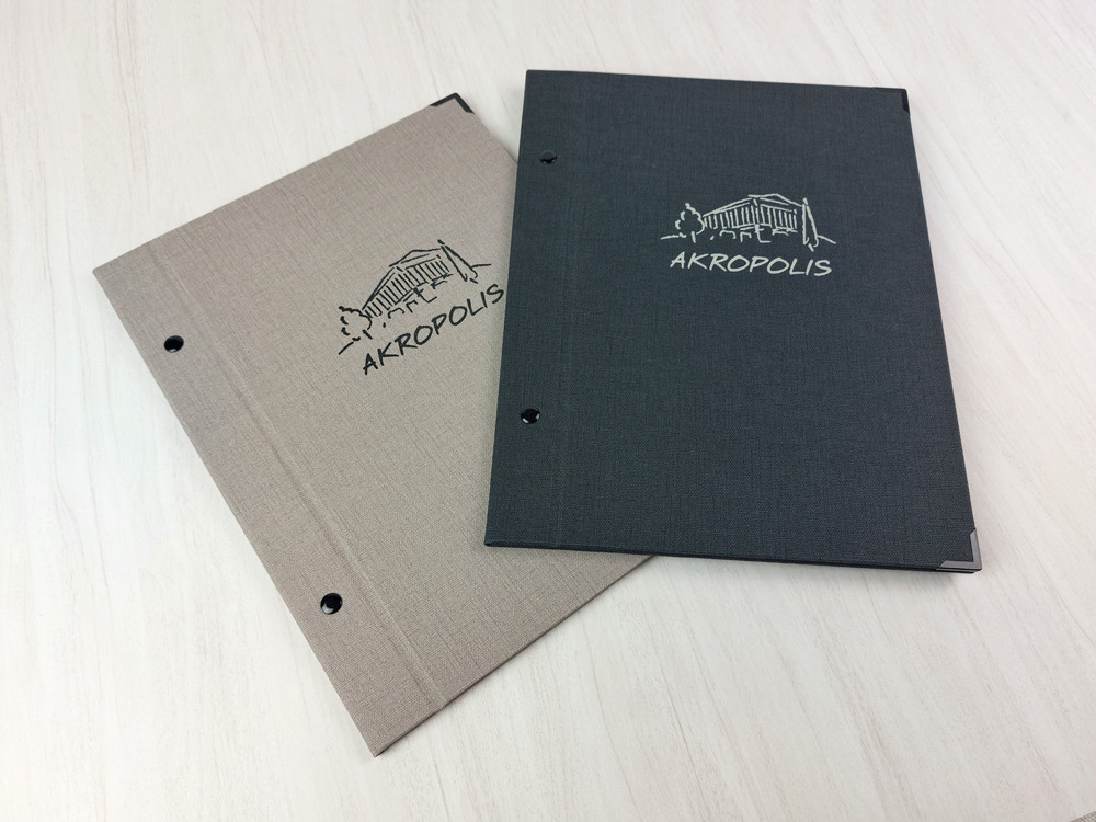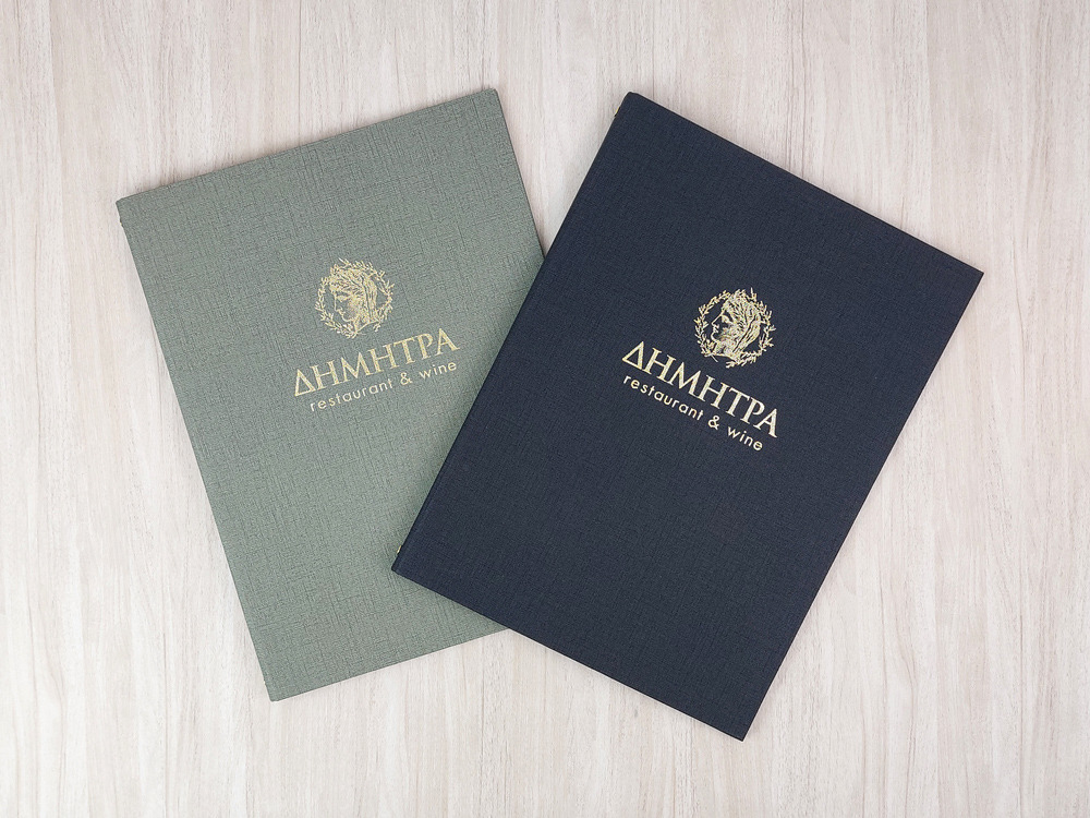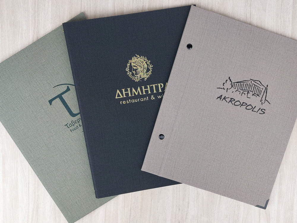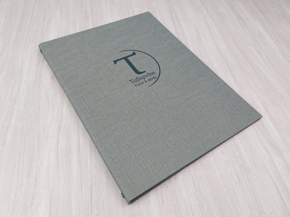 Χειροποίητοι κατάλογοι για εστιατόρια και καφέ επενδυμένοι από βινύλιο με όψη υφάσματος. Εκτύπωση λογοτύπου στο εξώφυλλο με Θερμοτυπία. Δυνατότητα κατασκευής σε οποιαδήποτε διάσταση. Διαθέσιμες 7 αποχρώσεις