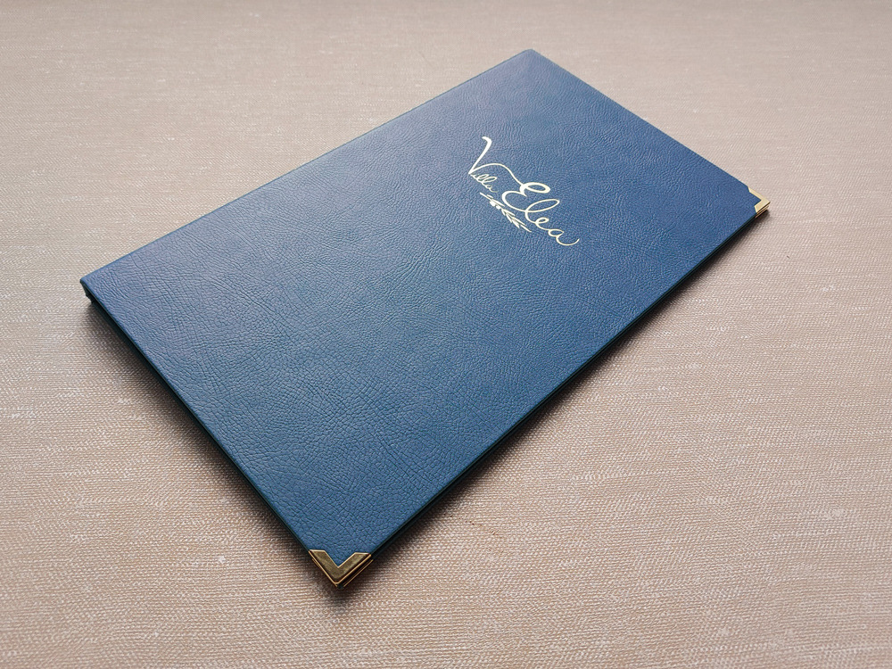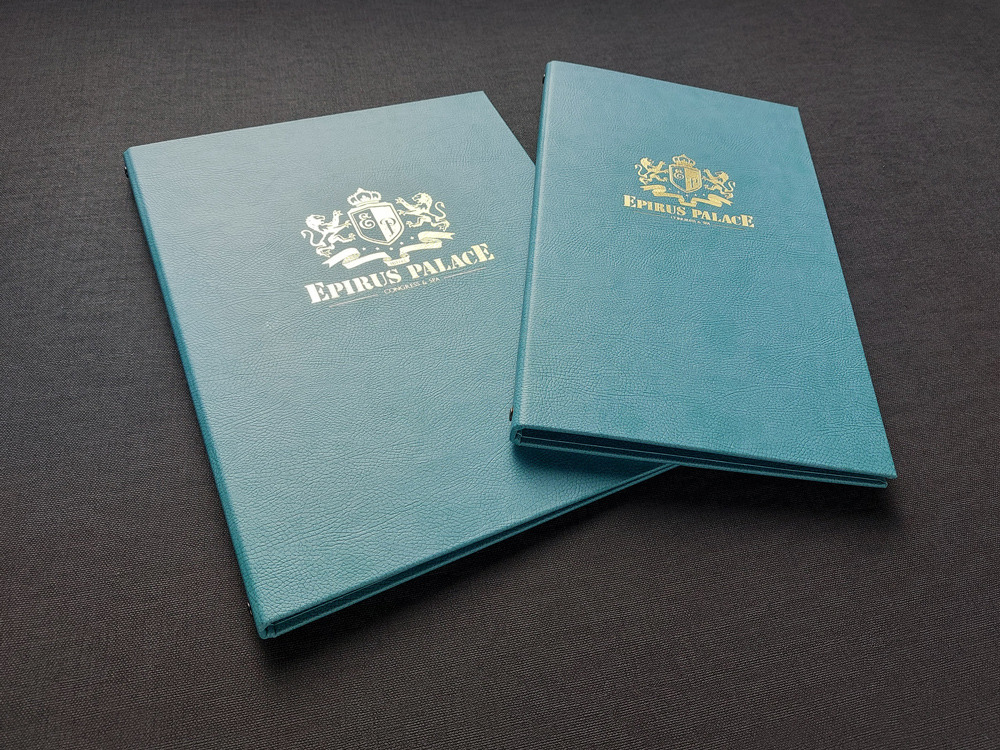 Σκληρόδετοι χειροποίητοι κατάλογοι εστιατορίων και καφέ επενδυμένοι από εξαιρετικής ποιότητας πυρογραφική δερματίνη. Εκτύπωση λογοτύπου στο εξώφυλλο με χρυσοτυπία / ασημοτυπία ή βαθυτυπία (ανάγλυφο). Δυνατότητα κατασκευής σε οποιαδήποτε διάσταση. Διαθέσιμές 17 αποχρώσεις.
