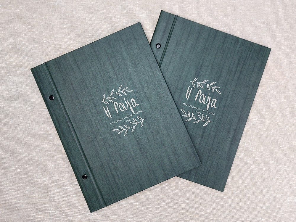 Χειροποίητοι κατάλογοι εστιατορίων επενδυμένοι από ανθεκτικό ημιανάγλυφο υλικό με ρεαλιστική όψη φυσικού ξύλου ή καπλαμά. Εκτύπωση λογοτύπου στο εξώφυλλο με έγχρωμη UV εκτύπωση, χρυσοτυπία ή Θερμοτυπία. Δυνατότητα κατασκευής σε οποιαδήποτε διάσταση. Διαθέσιμες 7 αποχρώσεις.